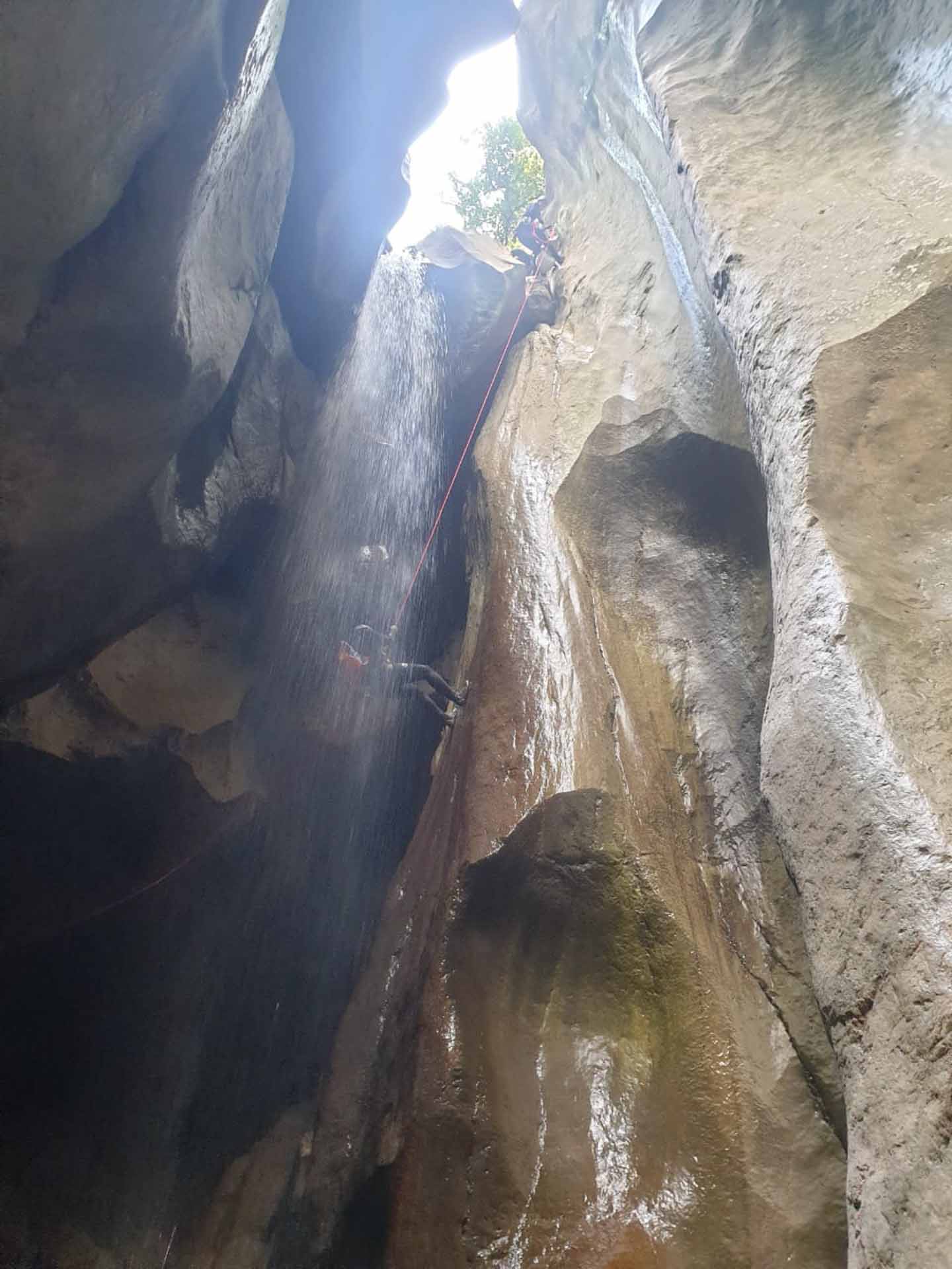No previous knowledge or experience is required. Whether you choose the family-friendly Nefeli Section A or the more demanding Deos Canyon, our professional guides provide a full safety briefing and manage every rappel for you.